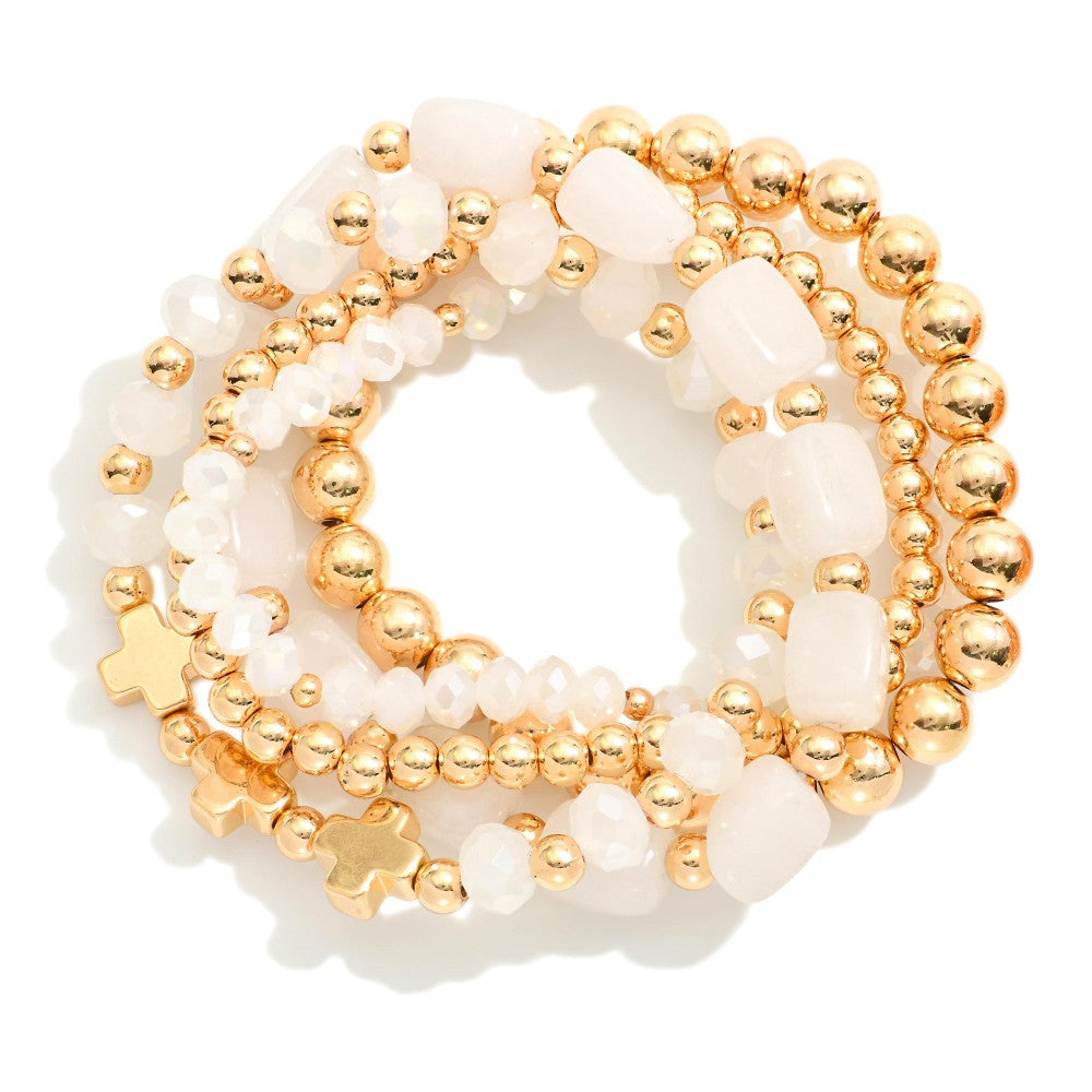 Set of 5 White & Gold Beaded Stretch Bracelets