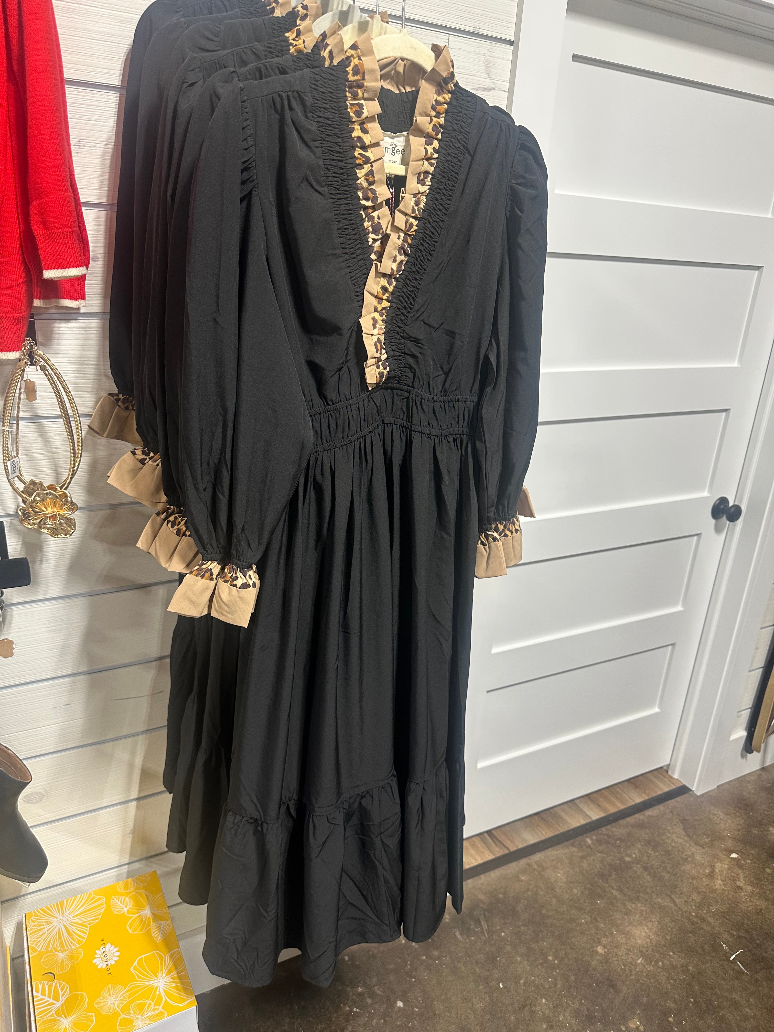 Black Ruffle Trim Midi Dress with Leopard Accent