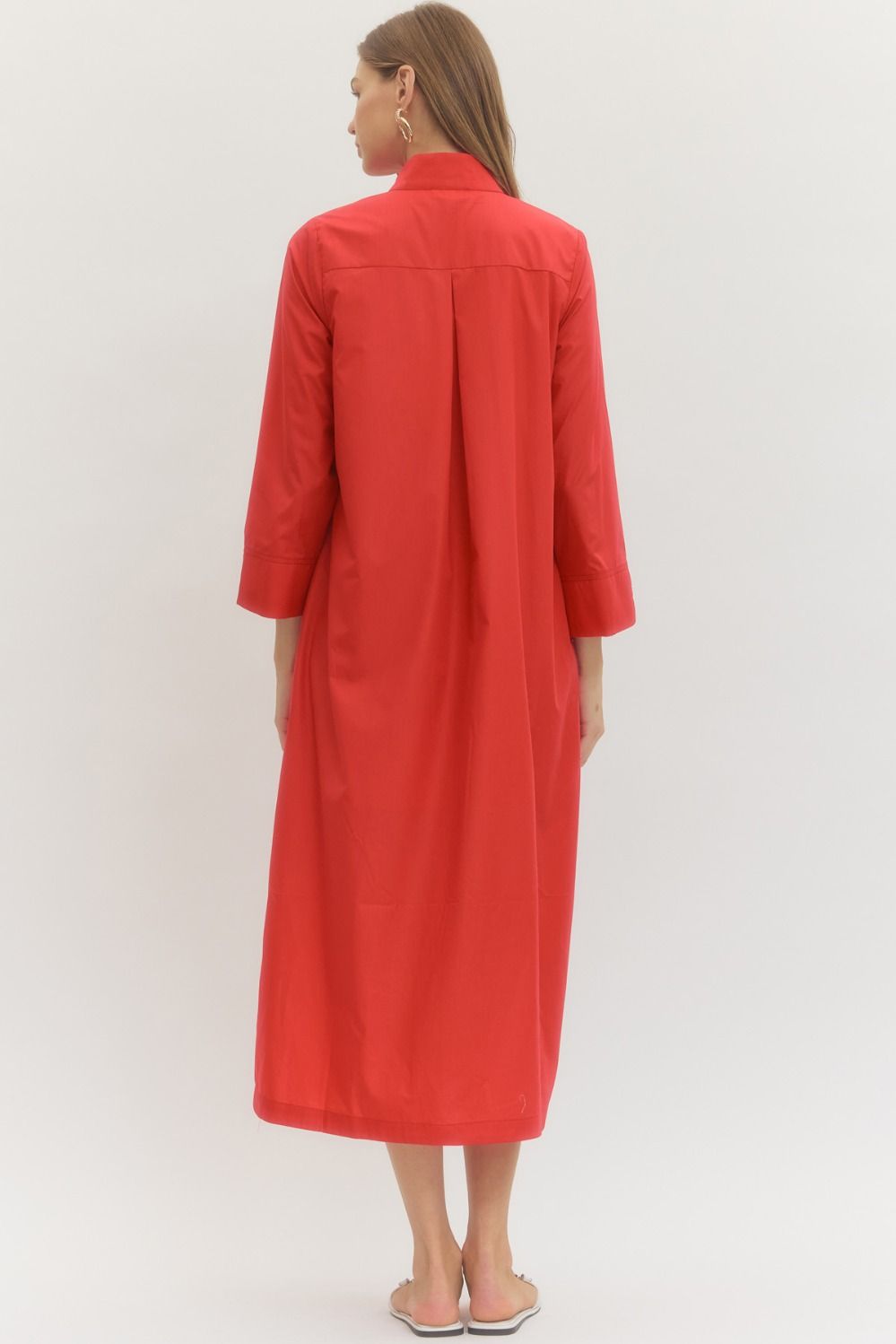 Red Long Sleeve Button Down Midi Dress
