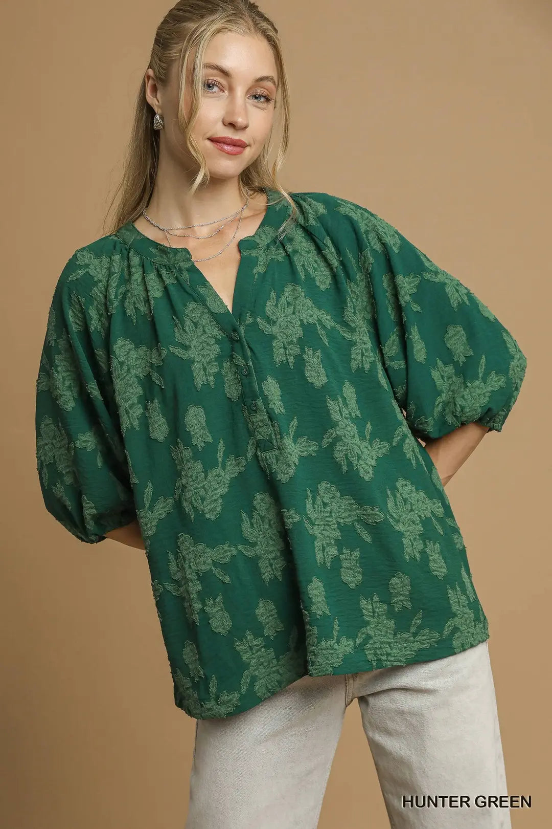 Hunter Green Textured Floral Puff Sleeve Blouse
