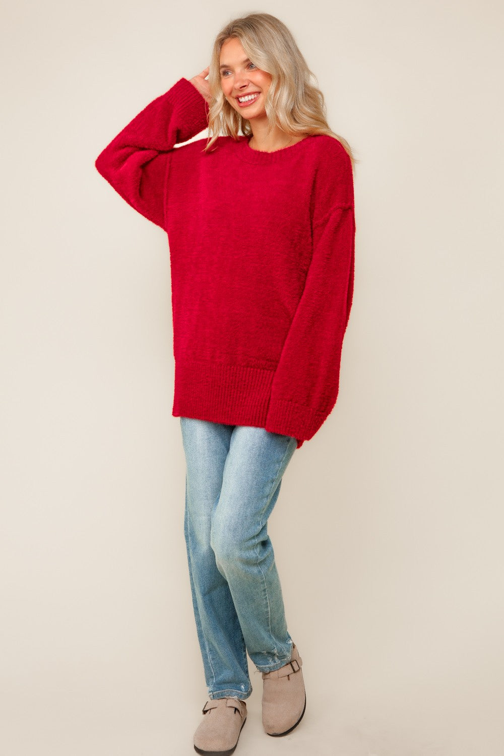 Red Fuzzy Soft Oversized Sweater W/ Side Slit