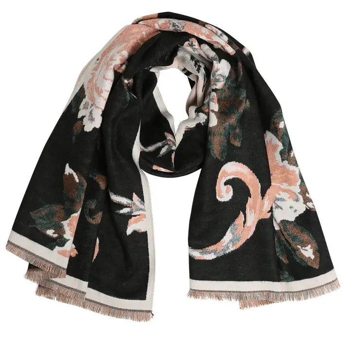 Bold Floral Wrap Oblong Shawl Scarf w Fringe -Elegant Allover Floral Pattern -Oblong Shape with Light Fringe Ends -Soft & Lightweight Feel -Effortless Fashion Scarf -100% Viscose One size (Approx. 71" L x 26" W) Soft and lightweight, this oblong scarf is crafted from 100% viscose for a smooth and comfortable feel. Designed for versatile styling, it can be draped as a shawl, wrapped for added warmth, or layered as an everyday accessory. Finished with delicate fringe ends, this timeless piece adds an effortless touch of elegance to any outfit and is perfect for year-round wear.